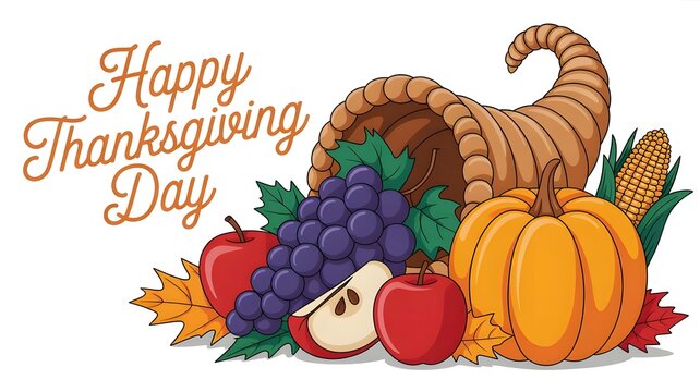 Happy thanksgiving day cornucopia with pumpkin, apples, grapes, and corn on a white background