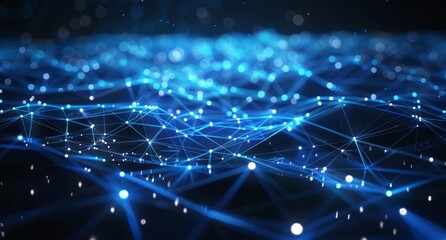 A glowing digital network of interconnected lines and nodes overlays a dark world map representing global communication and data flow