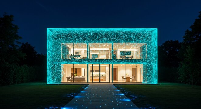 Stunning Modern Home with Glowing Cybernetic Overlay and Ambient Night Lighting