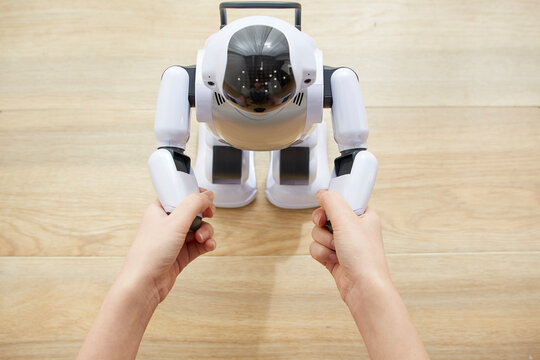 女性に手を握られているロボット