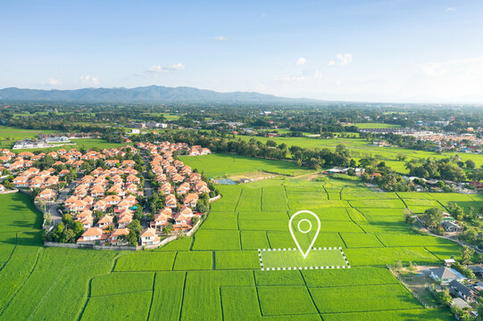 Land plot in aerial view. Identify registration symbol of vacant area for map. That property, real estate for business of home, house or residential i.e. sale, rent, buy, purchase or investment.