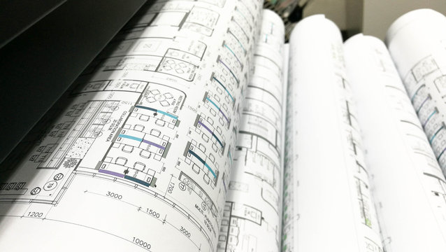 Industrial wide-format plotter printing monochrome vertical stripes on continuous paper