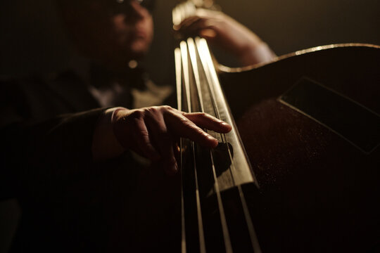 Middle aged Caucasian man playing double bass on stage, close up of hand plucking strings, jazz musician performing live music, blurred face in background, low angle view