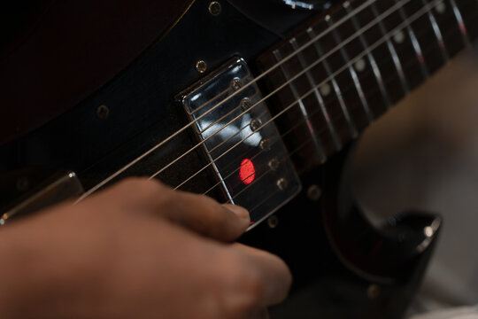 close up of asian man's fingers plucking strings on electric guitar