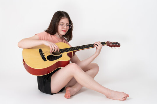 Barefoot female guitarist playing guitar, plucking strings and learning new melodies and chords. Musician sits on floor on white background, looks at strings of musical instrument while strumming it