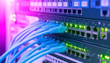 A close-up shot of a network switch with blue ethernet cables plugged in, with green indicator lights showing activity.