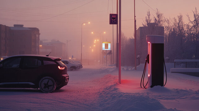 In garage where charging cable is plugged in charging station while a white electric car is being charged next to it. Focus is on the charging station with the cable plugged in it. Generative AI.
