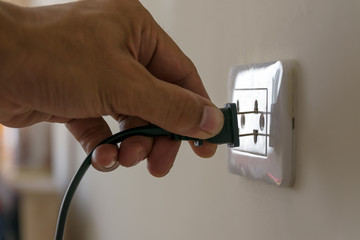 Electric European plug, isolate. The concept of saving electricity or charging. Black power cable with plug