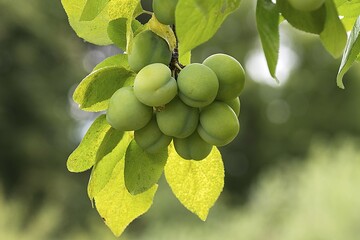 Immature Mirabelle (Prunus domestica) on a tree, Germany, Europe