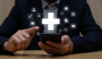 Male hand using smartphone with plus sign, medical icon Health concept: health insurance access to welfare, health and copy space