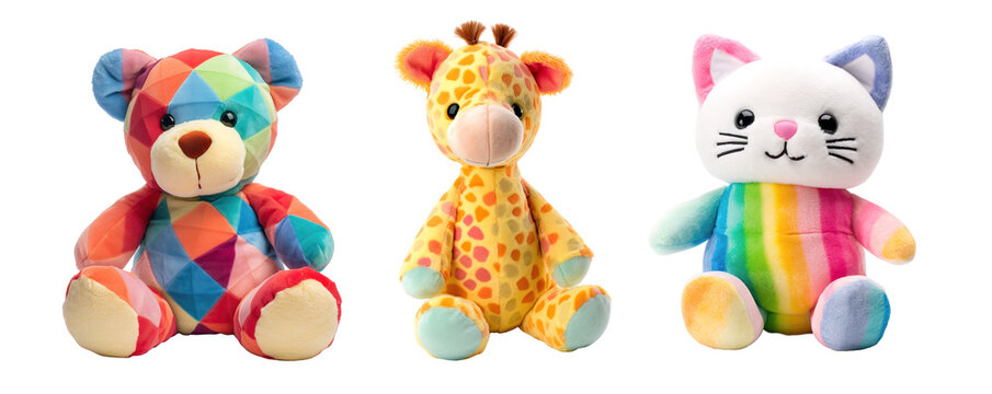 Modern teddy bear, giraffe and kitten with vibrant colors over isolated white transparent background