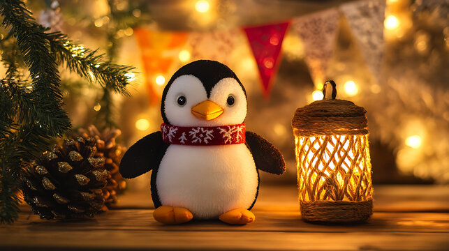 Penguin plush wearing festive sweater snow and lights reflecting