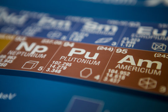 Plutonium symbol - Pu. Element of the periodic table zoomed with magnifying glass