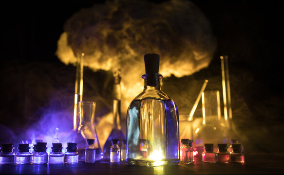 Glass flasks with explosive liquid on a wooden table. Chemical experiments at home. Vintage laboratory.