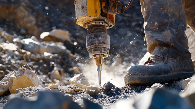 A close-up of a construction worker using a pneumatic drill to break concrete at a road construction site, Concrete demolition scene, Action-oriented style