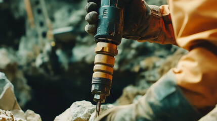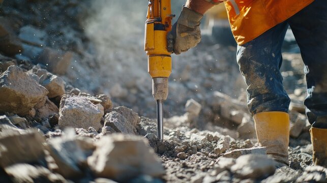 Construction worker operating a pneumatic drill to break rocks. Featuring strength and precision
