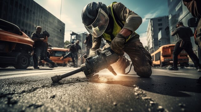 A detailed close-up of a construction worker using a pneumatic drill to break concrete pavement during road construction, Road construction scene, Infrastructure development style