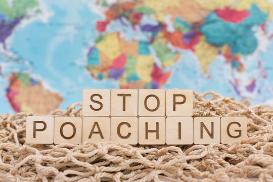 Wooden letters on world map background Stop Poaching sign, stop hunting concept