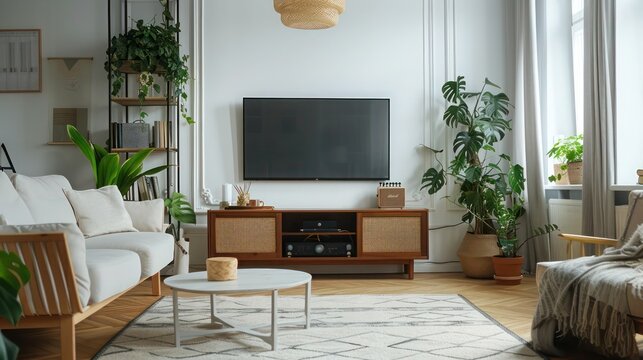 Front view of a serene white podcast studio background wall in a comfortable apartment setting, perfect for professional and relaxed podcasting environments