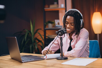 African american podcaster speaking into microphone wearing headphones in home studio