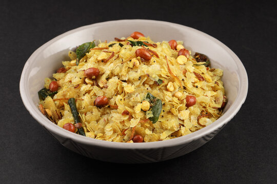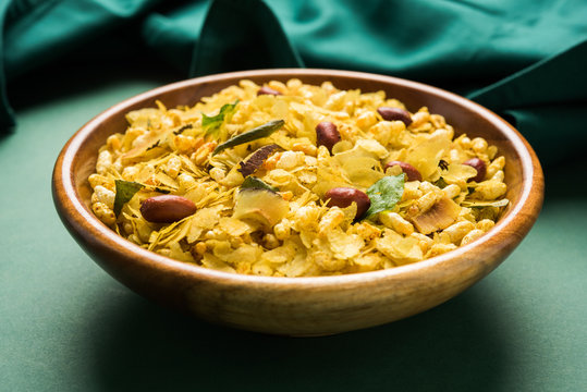 Indian snack "poha chivada" prepared and consumed during diwali festival in india.