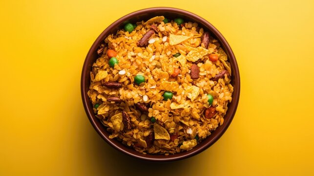 Colorful bowl of traditional Indian poha chivda snack with nuts and spices against a vibrant yellow background. Perfect for culinary presentations.