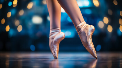 Close-up of dancer's feet in satin pointe shoes on stage floor, blurred bokeh background showcasing elegance and grace of ballet