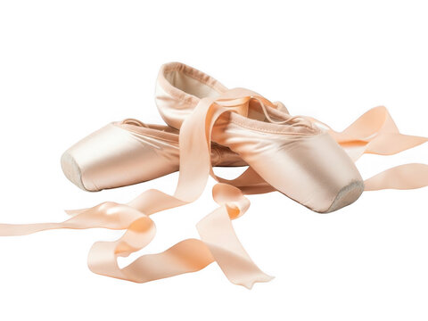 A pair of satin pink pointe shoes for ballet dance with ribbons untied, isolated on transparent background