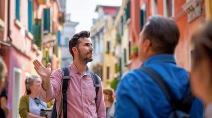 A tour guide leads a group of tourists on a sunny day. Red flag tour guide. Student group. Ankara, Turkey - May 6, 2023