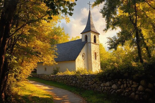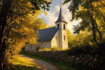 Small white chapel with pointed steeple surrounded by autumn trees and a stone wall along a sunlit path