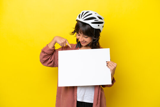 Young cyclist latin woman isolated on yellow background holding an empty placard with happy expression and pointing it