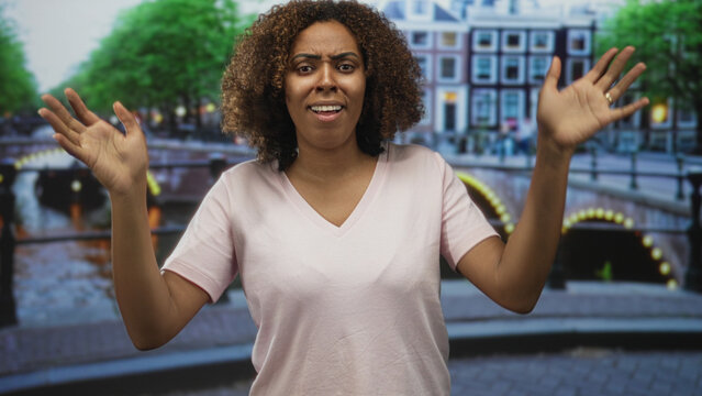 Woman points to chest and raises hands on a street by an amsterdam canal bridge with buildings and trees visible; confusion doubt.