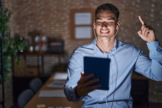 Hispanic man and asian woman collaborating with tablet beside vr headset in modern office