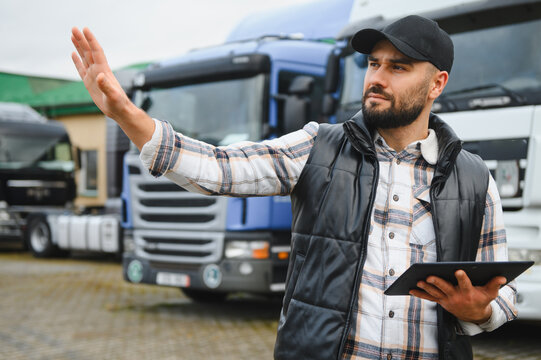 Warehouse managers reviewing inventory with tablet by pallet racks for logistics analytics