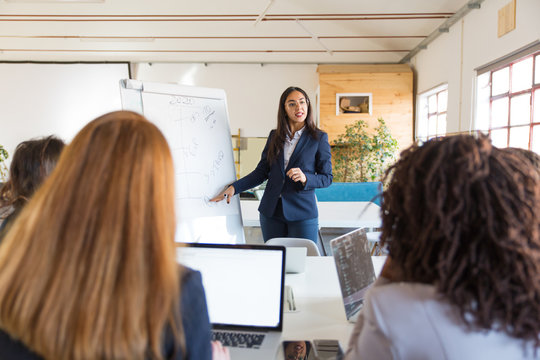 Businesswoman pointing at whiteboard during presentation. Multiethnic female colleagues looking at young speaker standing near whiteboard in meeting room. Business meeting concept