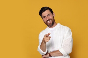 Smiling bearded man pointing forward finger on orange background. Space for text