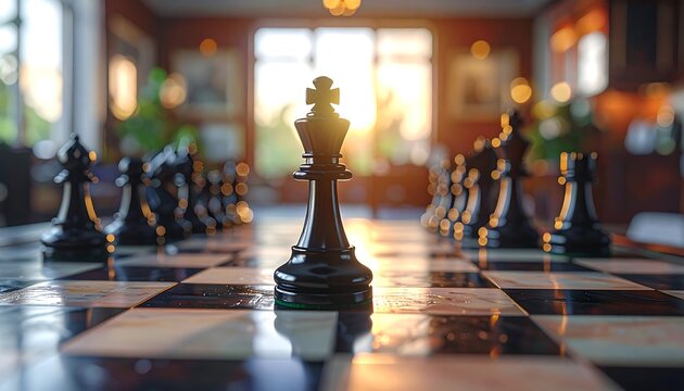 Strategic Stalemate: A close-up view presents a knight piece at the forefront, poised on the chess board, reflecting the complex strategy and mental acuity needed to win the game.