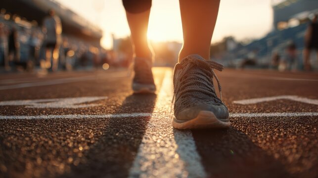 A close-up of a female runner's feet in sneakers positioned on a track at sunset, poised for the start of a race. The warm light enhances the anticipation of competition and training.