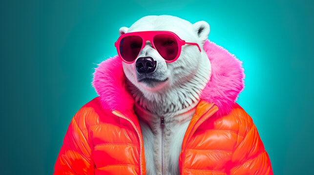 White Polar Bear standing in human DJ jacket wearing shades on a vibrant turquoise background.