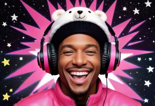 The picture shows a man wearing a pink jacket and white hat with a polar bear wearing pink headphones. He is smiling and stars can be seen in the background.