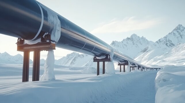 Scenic Mountain Pipeline with Diverse Pipes, Metal Rails, and Serene Landscape Featuring Greenery, Stream, and Snow-capped Peaks
