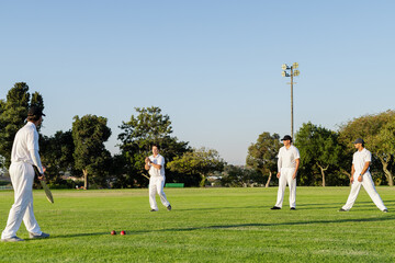 Four male cricketers in uniforms swinging cricket bat near red balls under floodlight pole on grass