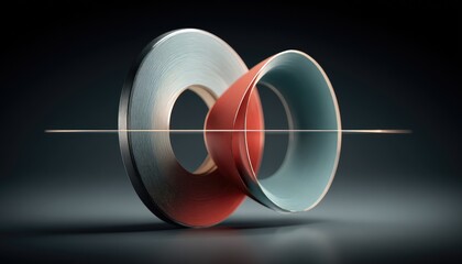Abstract, layered rings in teal and rust, mirrored on dark background