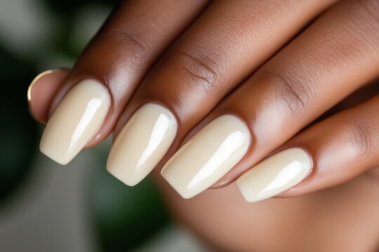 beautifully manicured hand with smooth, oval-shaped nails painted in a soft butter yellow shade. The high-gloss finish reflects natural light, emphasizing the creamy pastel hue
