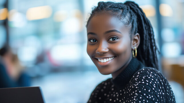 Young woman with playful buns in hair, wearing yellow polka dot sweater, smiling against blue background
