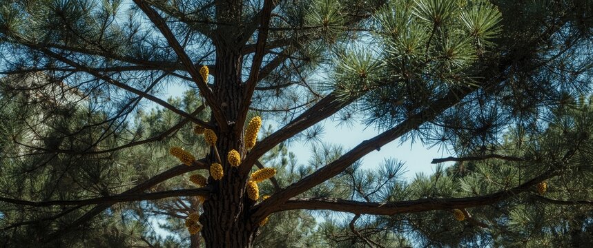tree releases pollen in the air during spring, with sunlight and blurred background
