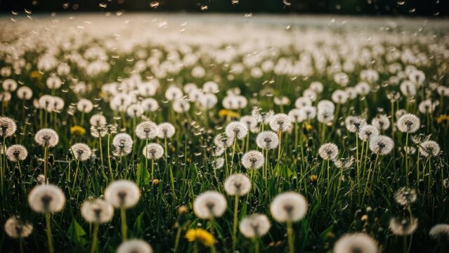 Field of dandelions with white seed heads ready to release, soft focus and sunlight