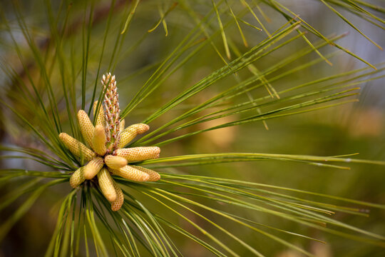 Southern long needle pine tree flowering to release pollen in southern Maryland USA
