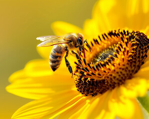 Bee collecting pollen on vibrant yellow daisy macro nature close-up for pollination study