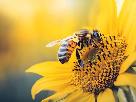 Honeybee pollinating blooming yellow sunflower in field